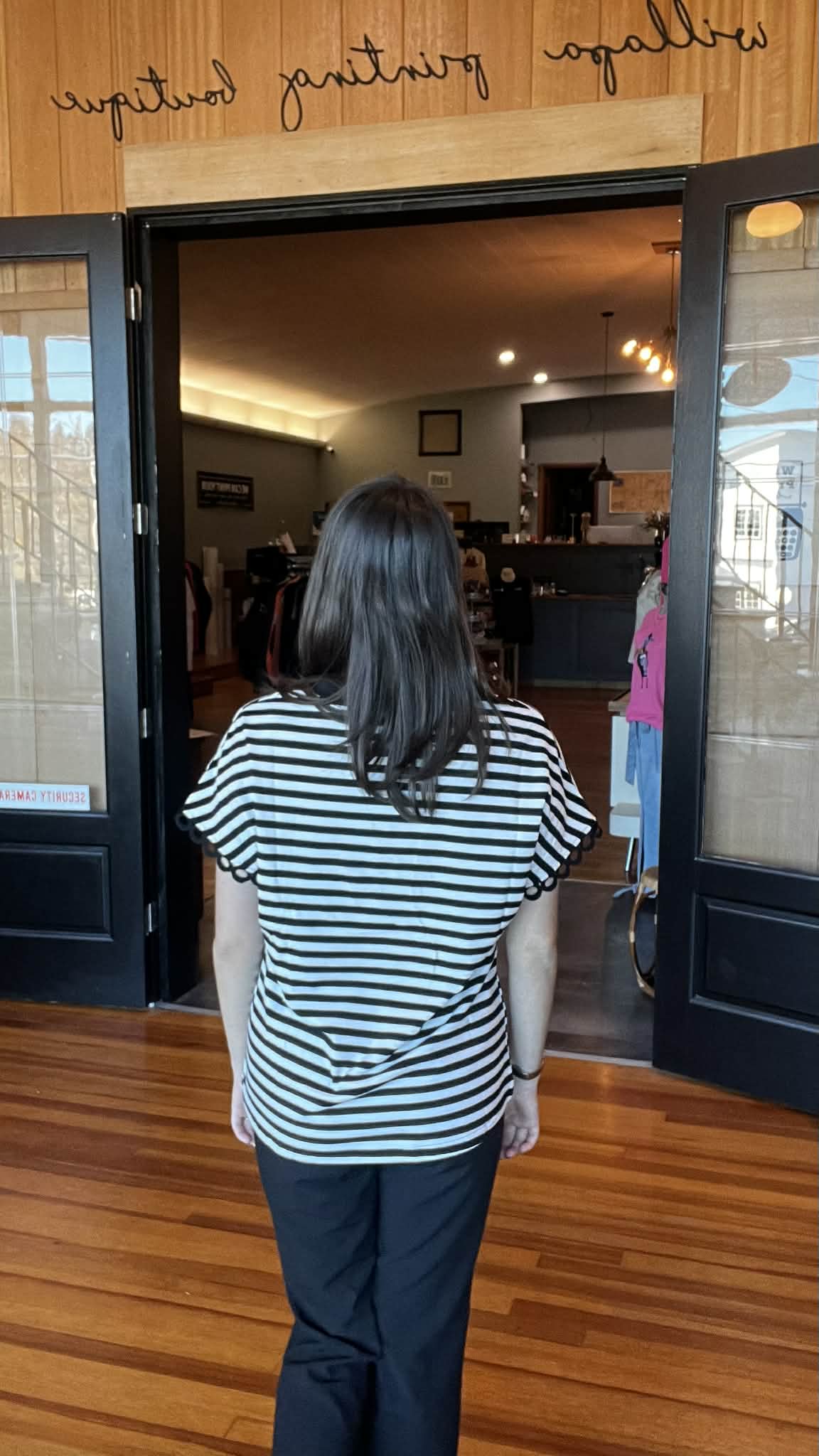 Stripes never go out of style—especially when they're paired with a flattering V-neck and delicate trim details. This casual tee strikes the perfect balance between effortless and put-together, making it your go-to for everything from weekend hangouts to laid-back office days. The soft fabric feels as good as it looks, while the classic black and white pattern works with practically everything in your closet. Throw it on, feel confident, and let the stripes do the talking.