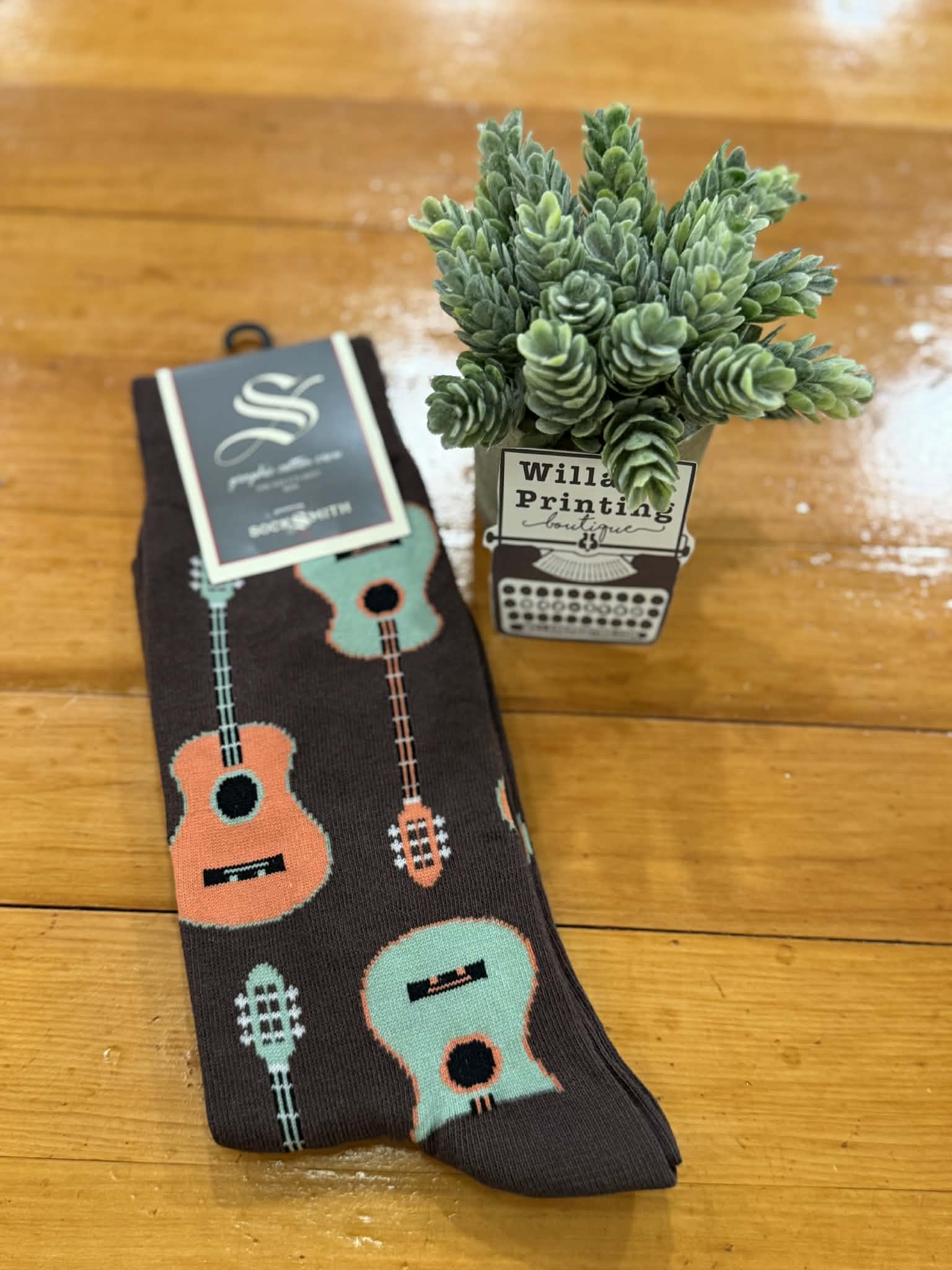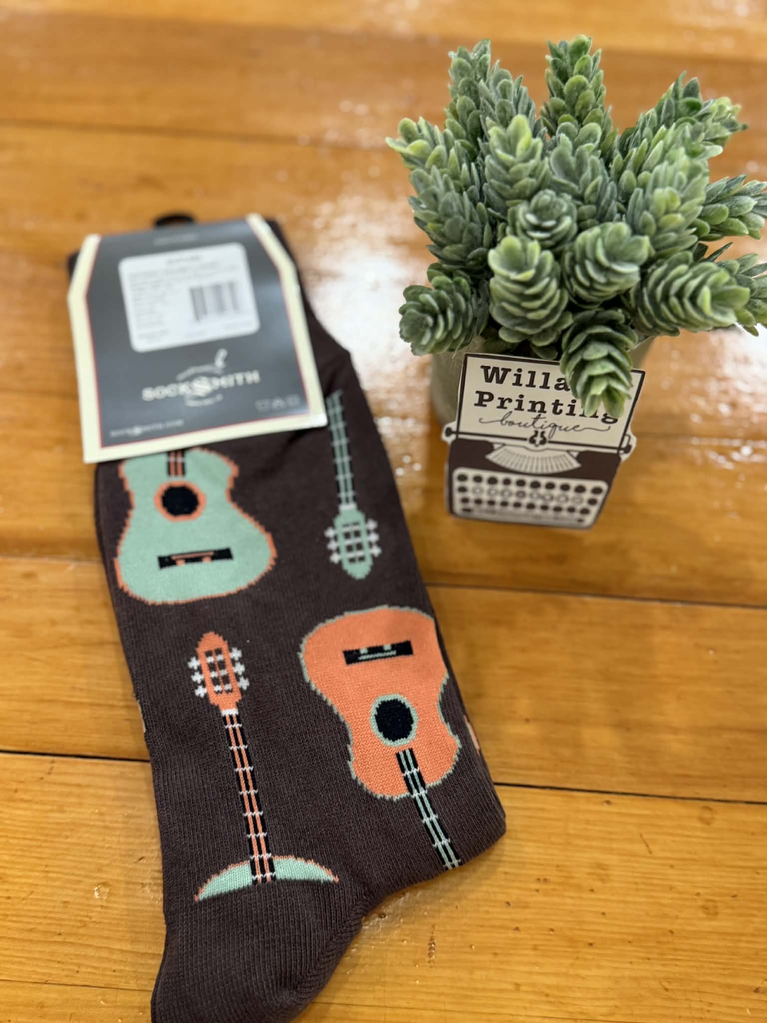 Turn up the volume on your sock game with these rockin' guitar socks for music lovers everywhere. Featuring a dynamic design of funky orange, brown and teal that celebrates the power of six strings, these socks blend nylon, cotton, and spandex for a comfortable fit that keeps pace with your rhythm. Whether you're a seasoned musician, a concert enthusiast, or just someone who lives and breathes music, these socks let your feet shred with style. Crank it up and strut your stuff!