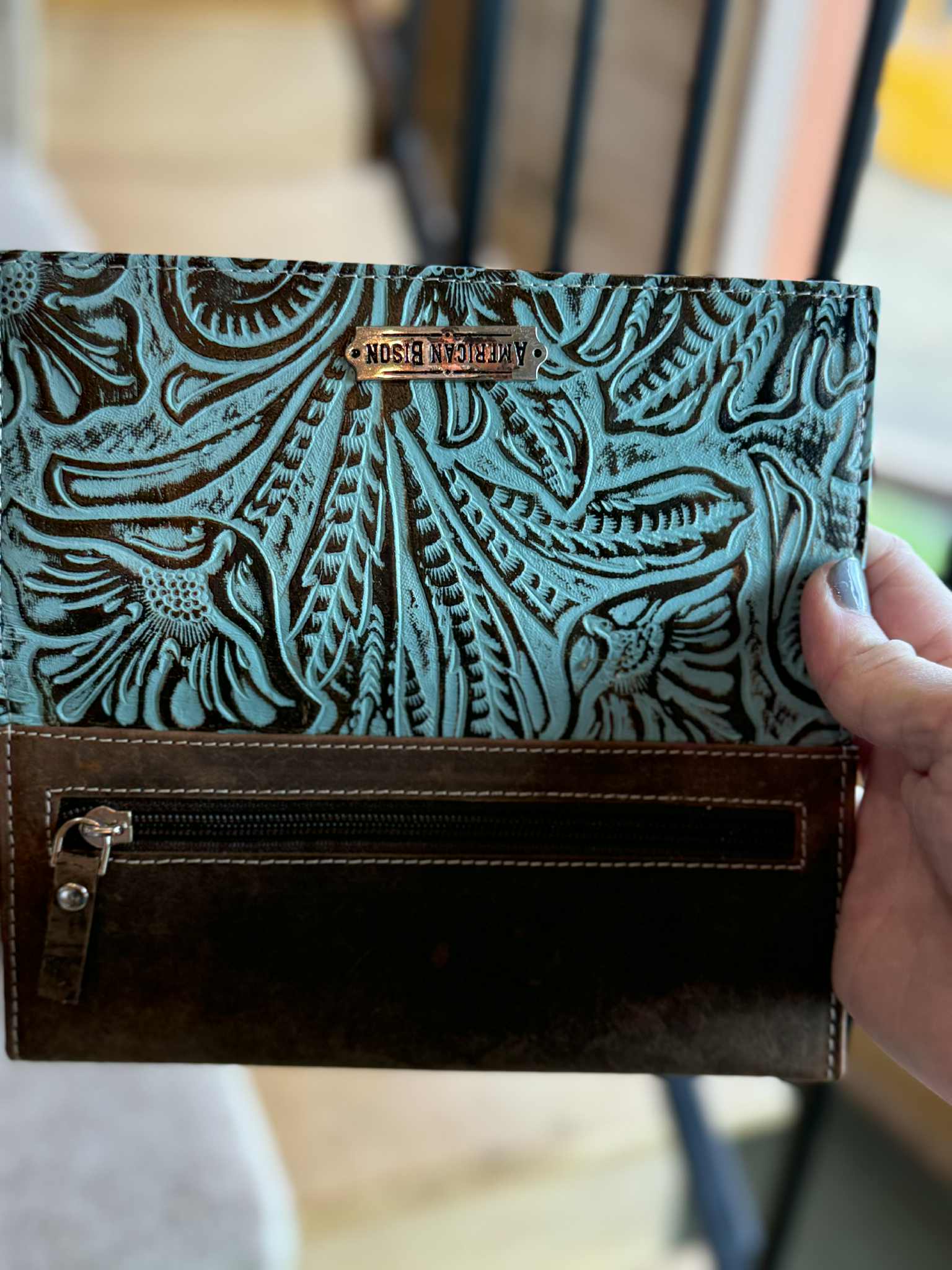TEAL BLUE FLORAL TOOLED LEATHER SNAP CLOSE CLUTCH WALLET