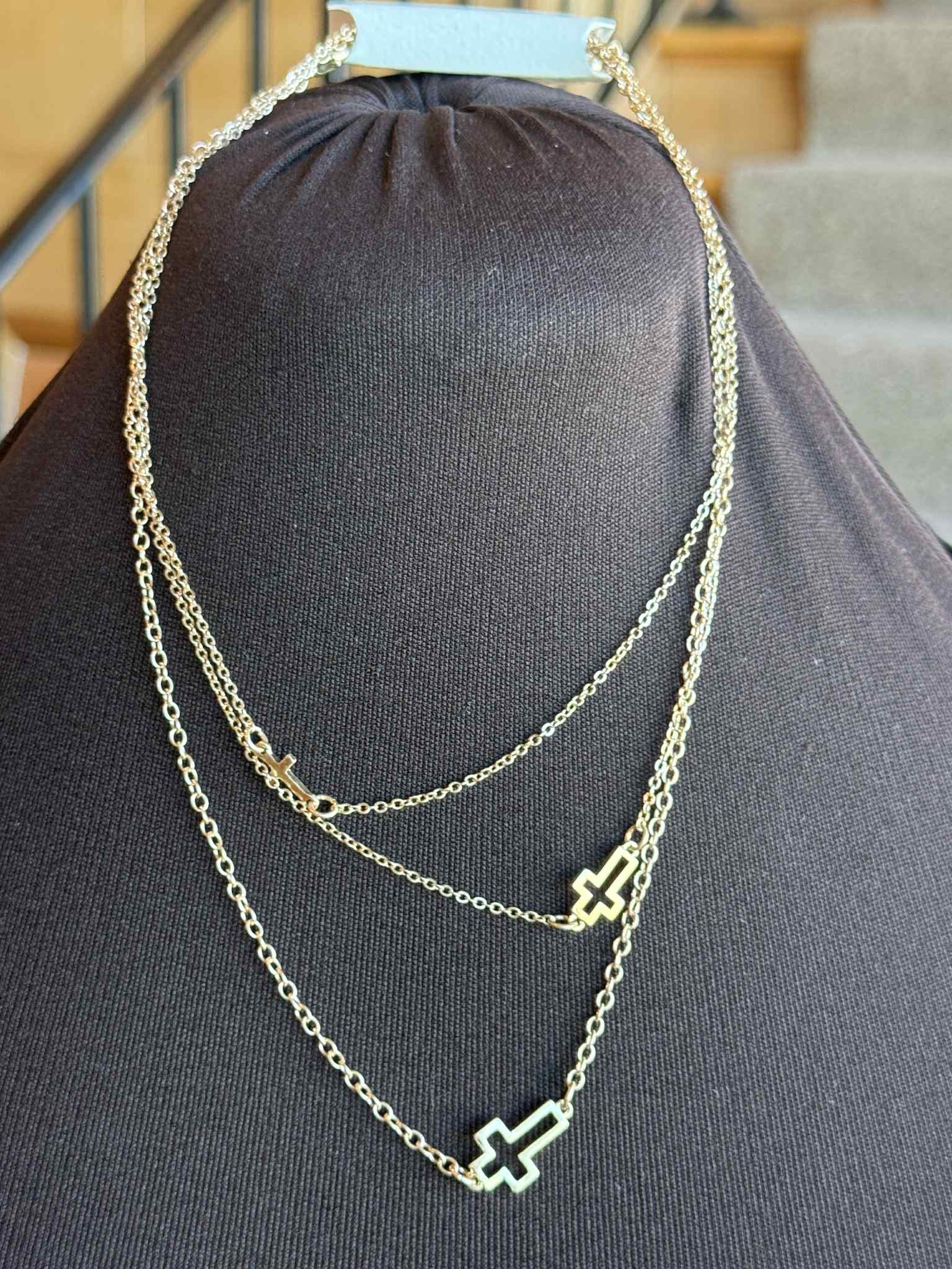 Elevate your style with this elegant Three Layer Cross Gold Necklace. Featuring three delicate chains adorned with subtle cross pendants, it offers a timeless look that complements any outfit. Crafted in a warm gold finish, this necklace adds a touch of sophistication and meaningful charm, perfect for layering or wearing alone for a refined statement. Ideal for daily wear or special occasions, it effortlessly blends faith and fashion in one beautiful accessory.