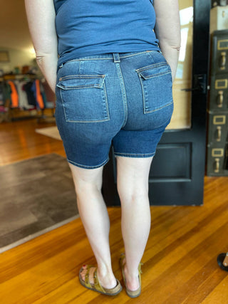 Complete your summer wardrobe with these must-have dark wash Judy Blue jean shorts! Featuring flap back pockets and a 6 3/4 inch inseam, they offer both style and functionality. Pair with your favorite summer top for a trendy and comfortable look. Don't miss out on these versatile and playful shorts!